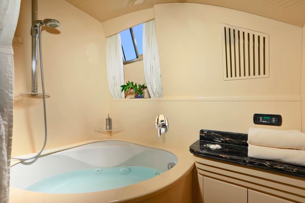 Bedroom Three has twin beds, TV, walk in wardrobe and en suite shower room. This large bedroom also has a separate seating area and a private terrace.