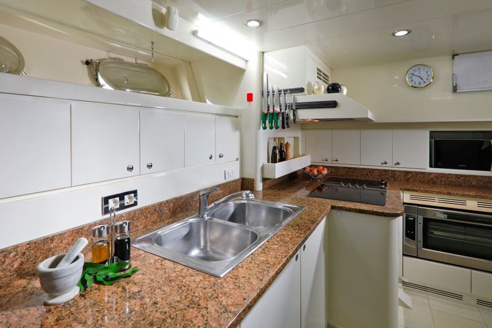 Launched in 2002 and refitted in 2019, this luxury Falcon Yacht is a powerful classic beauty and has an elegant interior, tastefully decorated, with the addition of state of the art electronics and updated features like a full size Jacuzzi.